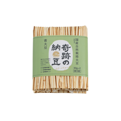 木村秋則さん監修のもと栽培された遺伝子組換えでない国産自然栽培の「青大豆」と、昭和23年から培われてきた菊水食品の納豆づくりの技術を用いて、世界に誇れる【奇跡の納豆】をつくりあげました。